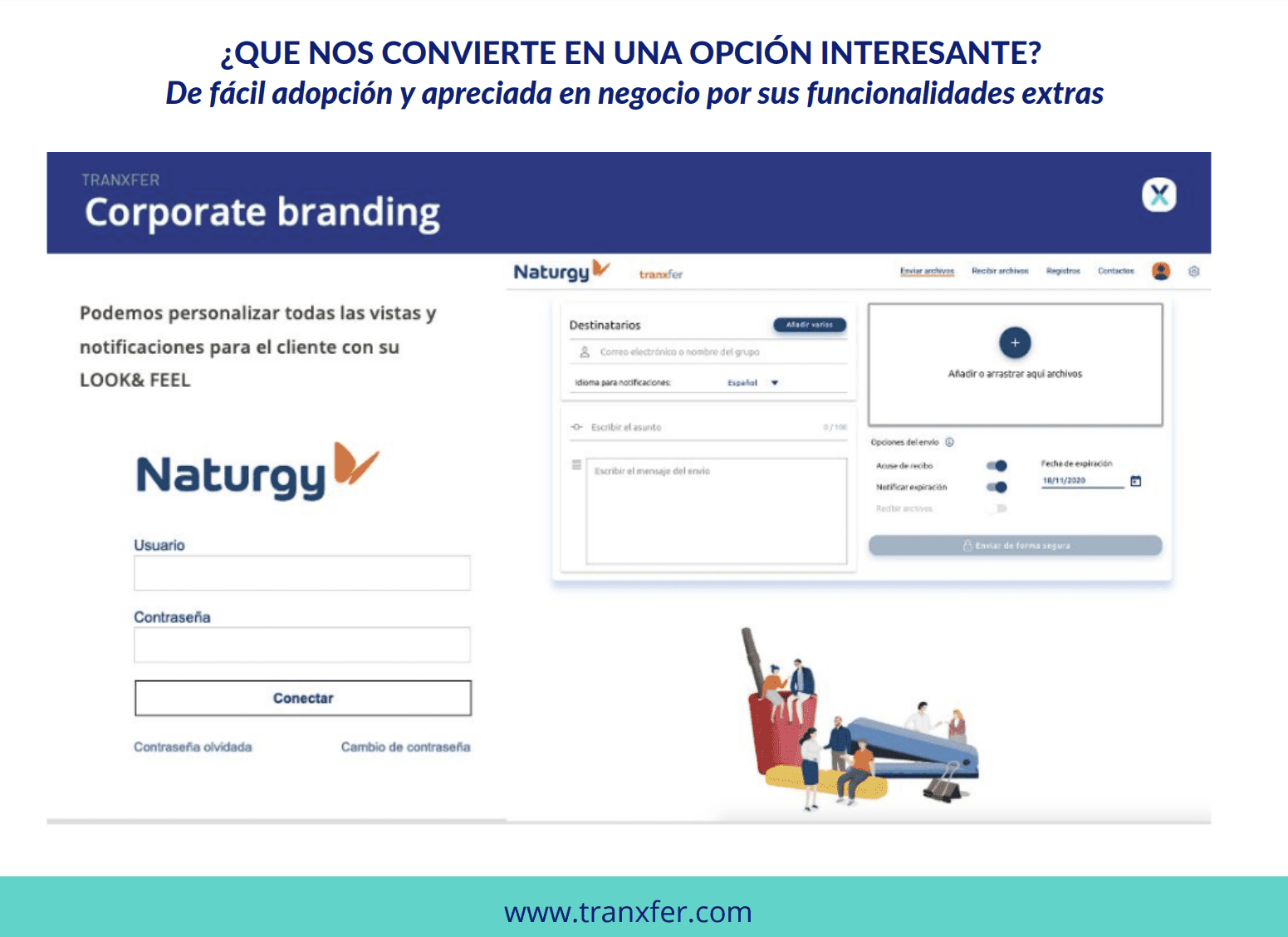 Tranxfer es la herramienta perfecta para tus empleados como alternativa a WeTransfer y otras plataformas para compartir ADJUNTOS Y ARCHIVOS GRANDES con las máximas garantías de seguridad y características avanzadas.