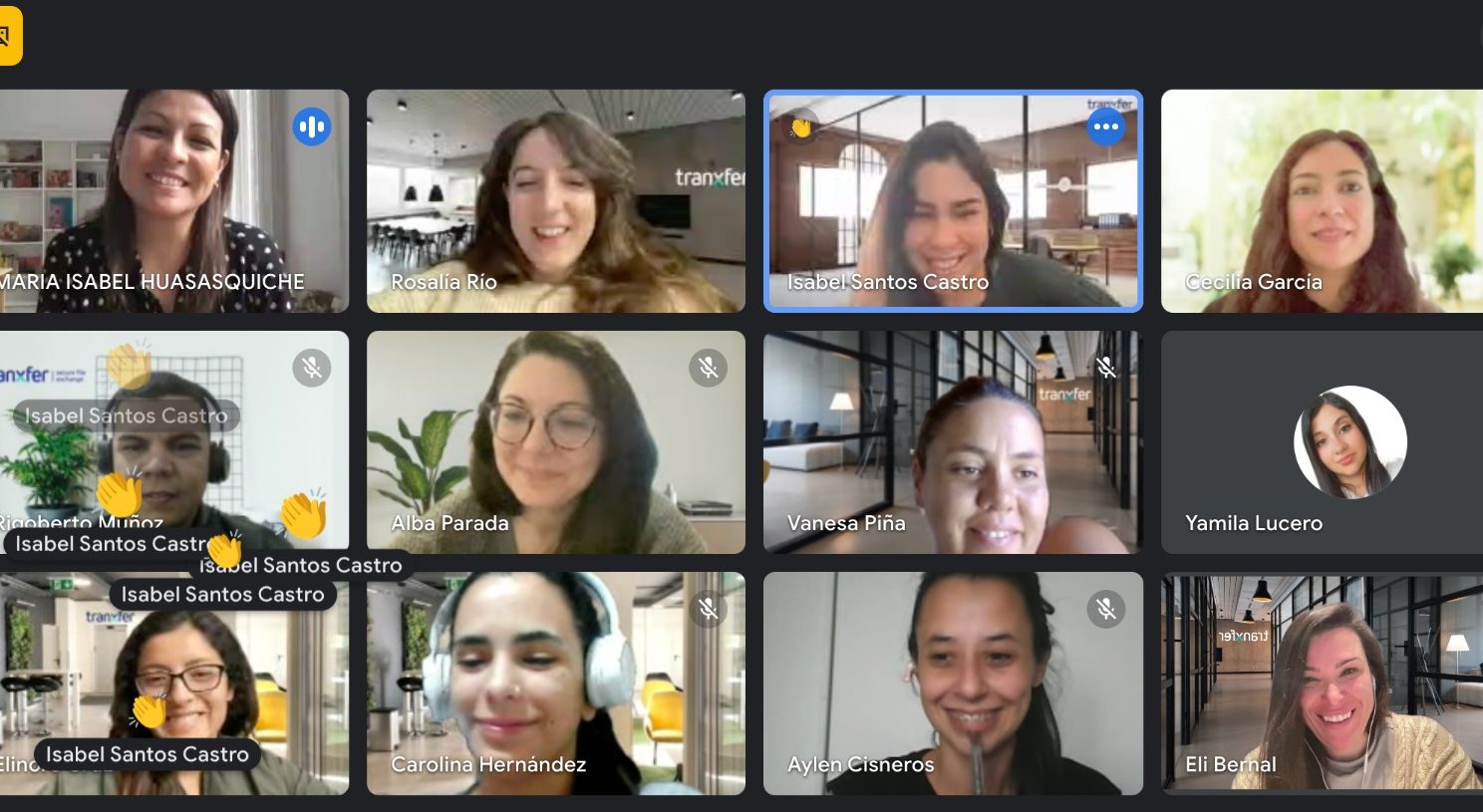 Equipo multicultural de Tranxfer conectando desde Argentina, Colombia y otros países.